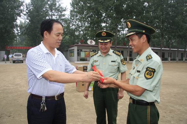 随后,江文玉书记一行分别到县人武部、县消防大队、教导大队、武警中队进行慰问,为全体官兵送去了慰问金和慰问品。在武警中队,江文玉书记与官兵们进行亲切交谈。他说:民权的发展离不开部队官兵的辛勤劳动,你们坚守岗位,保卫着一方的平安,在“八一”建军节来临之际,我代表全县人民向全体驻地官兵致以崇高的敬意。希望军队和地方在以后的时间里,密切配合,共同为民权的跨越发展而努力奋斗。